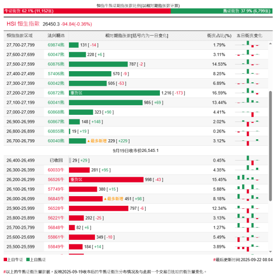 过去5日,恒指牛证合计约1.09亿港元资金净流出套现;恒指熊证则合计约1.92亿港元资金净流入。街货分布方面,至上周五,恒指牛证街货占比约62.1%,分布在收回价25900点至26500点之间,累计相当约2936张期指合约;恒指熊证街货在收回价26700点至27300点之间,累计相当约2920张期指合约。