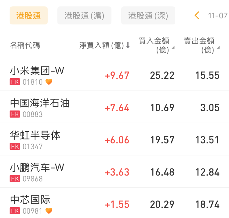 小米集团-W、中国海洋石油、华虹半导体分别获净买入9.67亿港元、7.64亿港元、6.06亿港元;