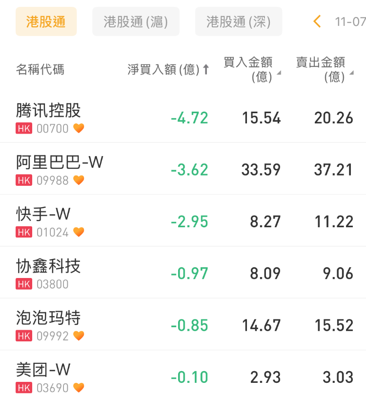 腾讯控股、阿里巴巴-W、快手-W分别遭净卖出4.72亿港元、3.62亿港元、2.95亿港元。