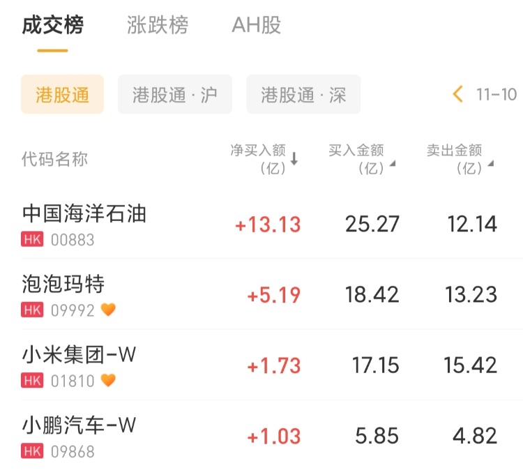 中国海洋石油、泡泡玛特、小米集团-W分别获净买入13.13亿港元、5.19亿港元、1.73亿港元;