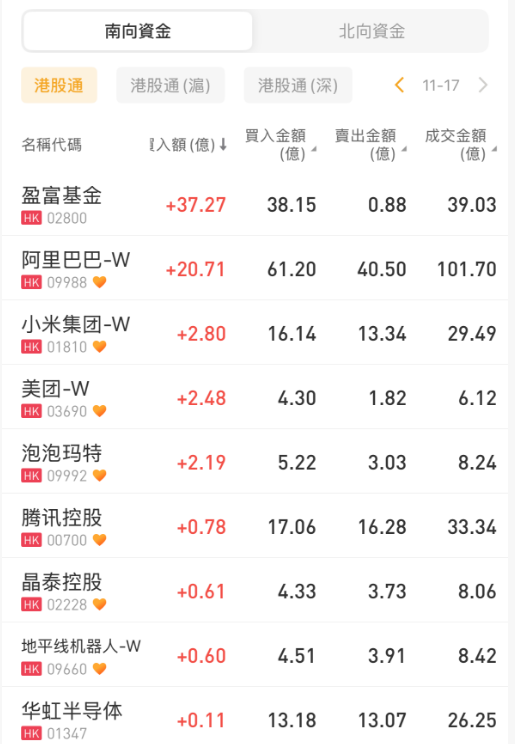 盈富基金、阿里巴巴-W 、小米集团-W分别获净买入37.27亿港元、20.71亿港元、2.8亿港元。