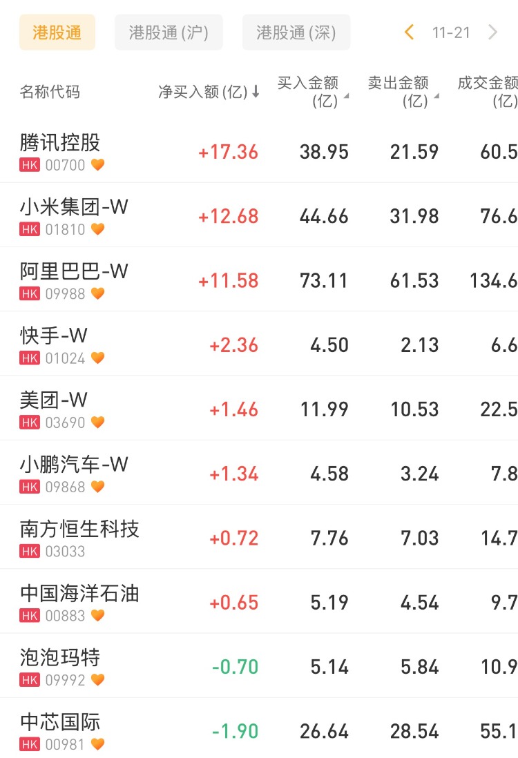 腾讯控股、小米集团-W、阿里巴巴-W分别获净买入17.36亿港元、12.68亿港元、11.58亿港元。