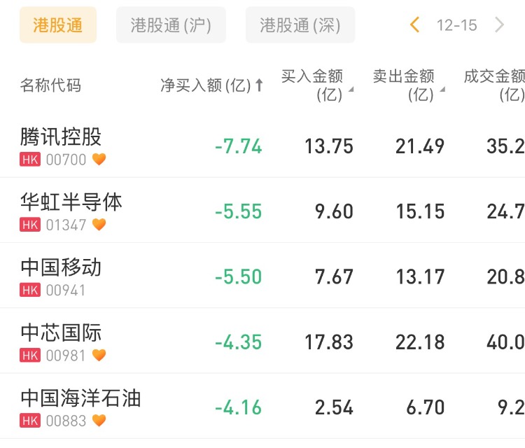 腾讯控股、华虹半导体、中国移动遭净卖出7.74亿港元、5.55亿港元、5.5亿港元。