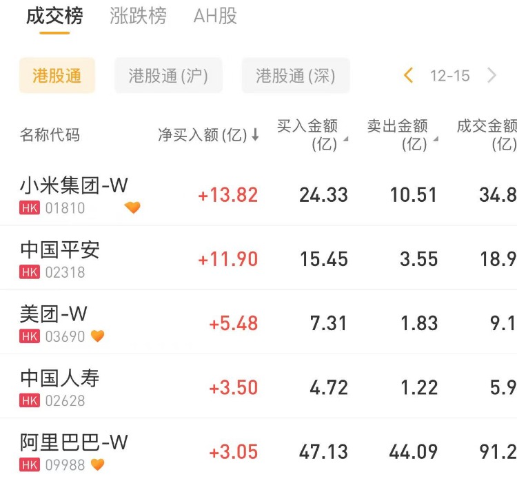 小米集团-W、中国平安、美团-W分别获净买入13.82亿港元、11.9亿港元、5.48亿港元;