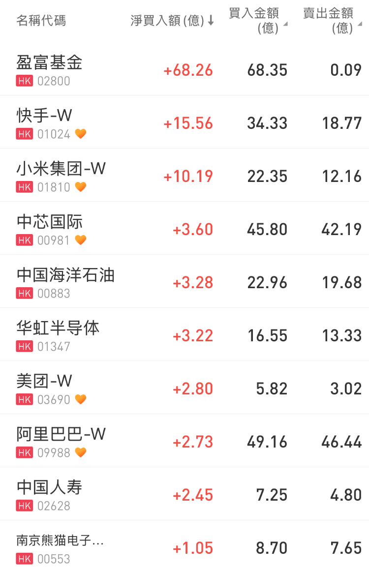 盈富基金、快手-W、小米集团-W分别获净买入68.26亿港元、15.56亿港元、10.19亿港元;
