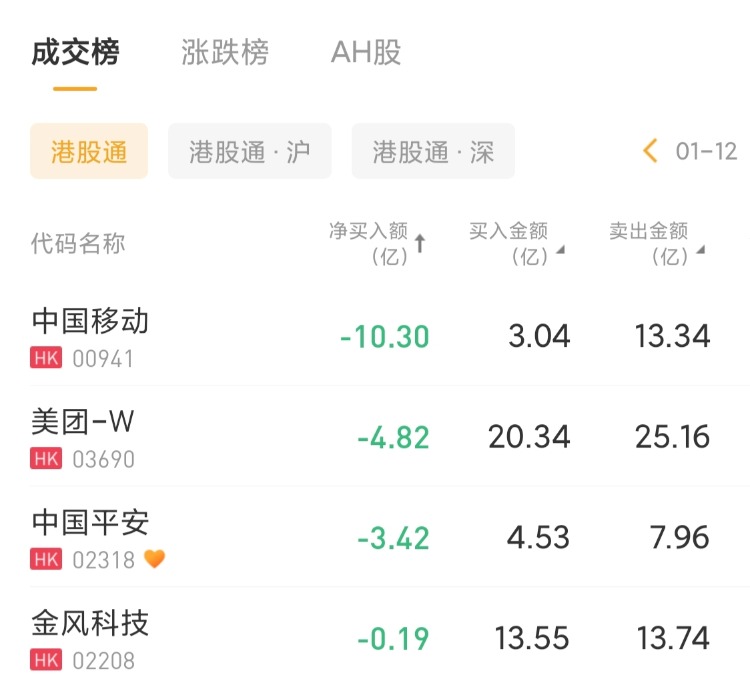 中国移动 、美团-W 、中国平安分别遭净卖出10.3亿港元、4.82亿港元、3.42亿港元。