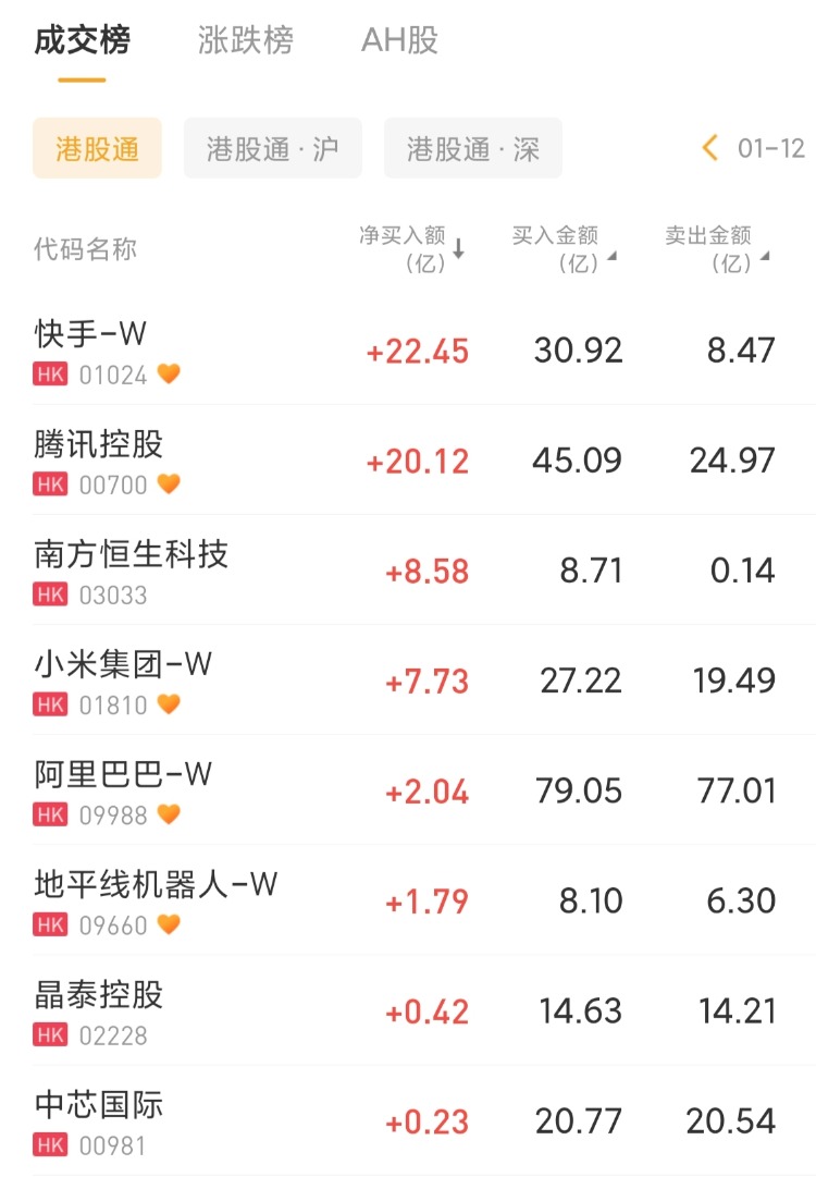 快手-W 、腾讯控股、南方恒生科技分别获净买入22.45亿港元、20.12亿港元、8.58亿港元;