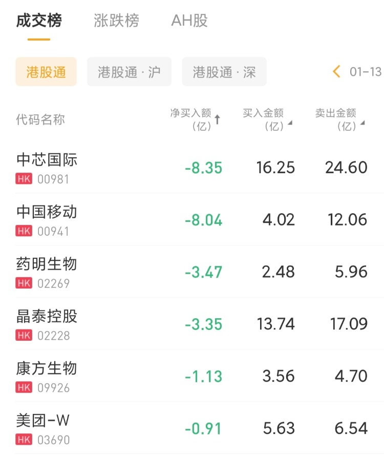 中芯国际、中国移动、药明生物分别遭净卖出8.35亿港元、8.04亿港元、3.47亿港元。