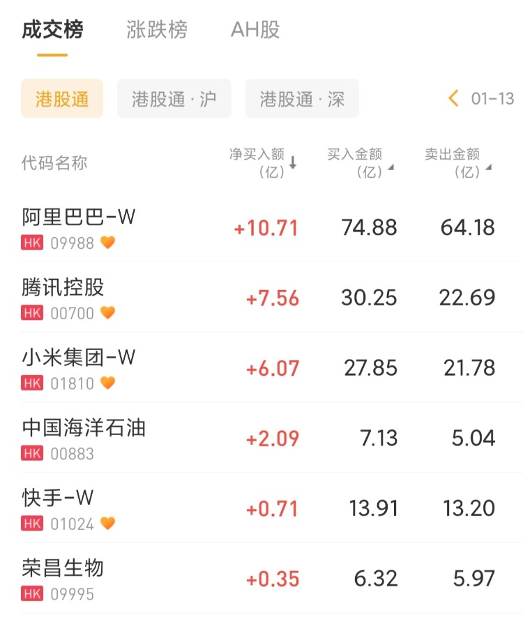 阿里巴巴-W 、腾讯控股、小米集团-W分别获净买入10.71亿港元、7.56亿港元、6.07亿港元;