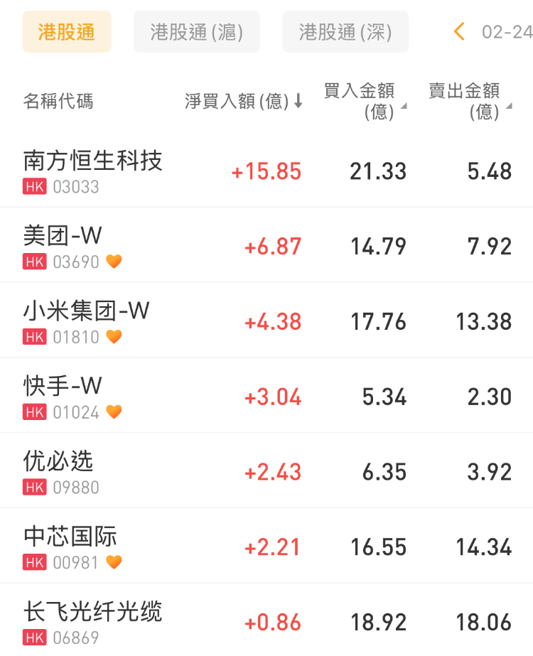 南方恒生科技、美团-W、小米集团-W分别获净买入15.85亿港元、6.87亿港元、4.38亿港元;