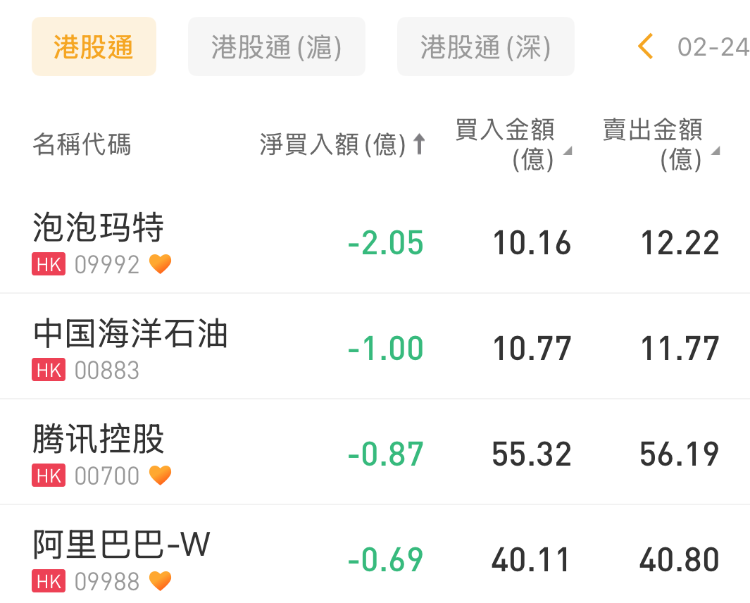 泡泡玛特、中国海洋石油、腾讯控股分别遭净卖出2.05亿港元、9989万港元、8677万港元。