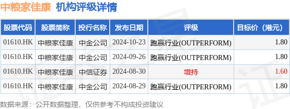 投行对该股的评级以跑赢行业(OUTPERFORM)为主,近90天内共有3家投行给出跑赢行业(OUTPERFORM)评级,近90天的目标均价为1.75港元。中金公司最新一份研报给予中粮家佳康跑赢行业(OUTPERFORM)评级,目标价1.8港元。