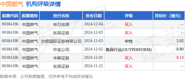 截至2024年12月6日收盘,中国燃气(00384.HK)报收于6.45港元,上涨1.74%,换手率0.22%,成交量1197.62万股,成交额7735.19万港元。投行对该股的评级以买入为主,近90天内共有4家投行给出买入评级,近90天的目标均价为7.62港元。申万宏源最新一份研报给予中国燃气买入评级。