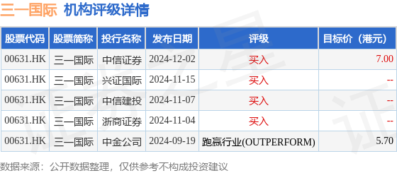 截至2024年12月11日收盘,三一国际(00631.HK)报收于4.95港元,上涨0.81%,换手率0.06%,成交量186.56万股,成交额921.14万港元。投行对该股的评级以买入为主,近90天内共有4家投行给出买入评级,近90天的目标均价为6.35港元。中信证券最新一份研报给予三一国际买入评级,目标价7港元。