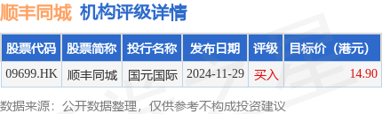 投行对该股的评级以买入为主,近90天内共有1家投行给出买入评级,近90天的目标均价为14.9港元。国元国际最新一份研报给予顺丰同城买入评级,目标价14.9港元。