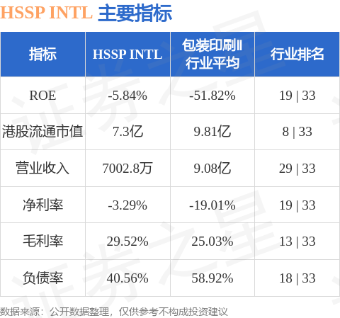 HSSP INTL港股市值7.3亿港元,在包装印刷Ⅱ行业中排名第8。主要指标见下表: