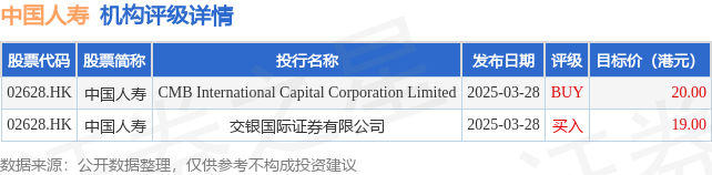 截至2025年4月29日收盘,中国人寿(02628.HK)报收于13.98港元,上涨0.58%,换手率0.45%,成交量3335.15万股,成交额4.67亿港元。投行对该股的评级以买入为主,近90天内共有1家投行给出买入评级,近90天的目标均价为19.5港元。CMB International Capital Corporation Limited最新一份研报给予中国人寿BUY评级,目标价20港元。