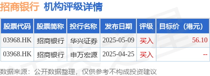 截至2025年5月9日收盘,招商银行(03968.HK)报收于46.0港元,上涨1.77%,换手率0.62%,成交量2857.51万股,成交额13.1亿港元。投行对该股的评级以买入为主,近90天内共有2家投行给出买入评级,近90天的目标均价为56.1港元。华兴证券最新一份研报给予招商银行买入评级,目标价56.1港元。