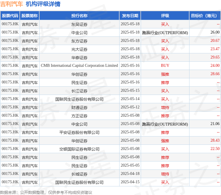投行对该股的评级以买入为主,近90天内共有37家投行给出买入评级,近90天的目标均价为23.62港元。东吴证券最新一份研报给予吉利汽车买入评级。