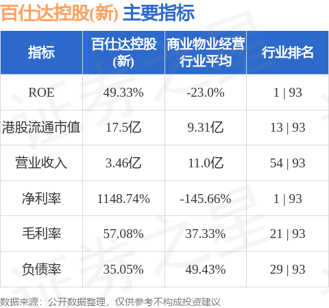 百仕达控股(新)港股市值17.5亿港元,在商业物业经营行业中排名第13。主要指标见下表: