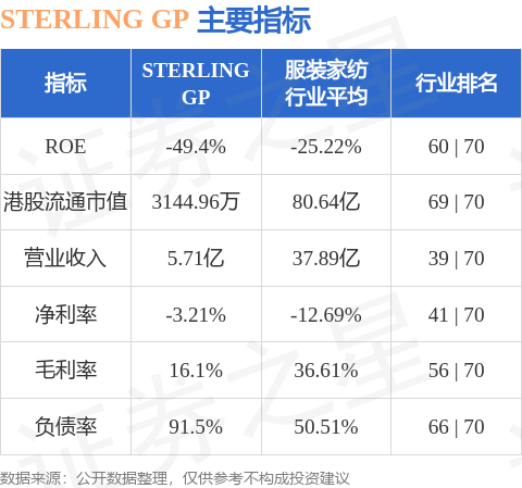 STERLING GP港股市值3144.96万港元,在服装家纺行业中排名第69。主要指标见下表: