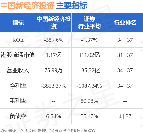 中国新经济投资港股市值1.17亿港元,在证券行业中排名第31。主要指标见下表:
