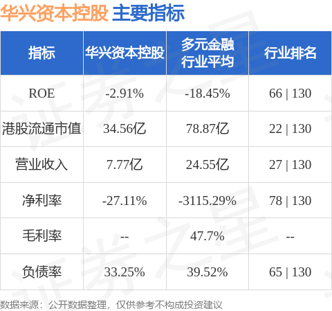 华兴资本控股港股市值34.56亿港元,在多元金融行业中排名第22。主要指标见下表:
