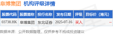 投行对该股的评级以买入为主,近90天内共有1家投行给出买入评级。东北证券最新一份研报给予阜博集团买入评级。