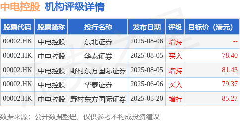 投行对该股的评级以增持为主,近90天内共有3家投行给出增持评级,近90天的目标均价为81.12港元。东北证券最新一份研报给予中电控股增持评级。