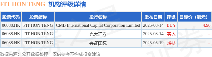 投行对该股的评级以增持为主,近90天内共有1家投行给出增持评级,近90天的目标均价为4.96港元。CMB International Capital Corporation Limited最新一份研报给予FIT HON TENGBUY评级,目标价4.96港元。