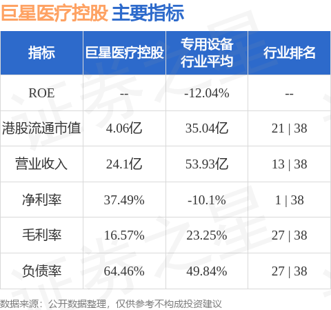 巨星医疗控股港股市值4.06亿港元,在专用设备行业中排名第21。主要指标见下表: