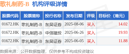 截至2025年8月15日收盘,歌礼制药-B(01672.HK)报收于17.74港元,上涨13.72%,成交量1279.01万股,成交额2.2亿港元。投行对该股的评级以买入为主,近90天内共有3家投行给出买入评级,近90天的目标均价为15.28港元。东吴证券最新一份研报给予歌礼制药-B买入评级,目标价14.02港元。