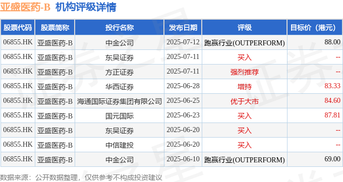 投行对该股的评级以买入为主,近90天内共有4家投行给出买入评级,近90天的目标均价为82.55港元。中金公司最新一份研报给予亚盛医药-B跑赢行业(OUTPERFORM)评级,目标价88港元。