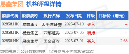 投行对该股的评级以买入为主,近90天内共有2家投行给出买入评级,近90天的目标均价为2.68港元。太平洋证券最新一份研报给予易鑫集团买入评级。