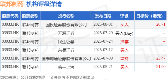投行对该股的评级以买入为主,近90天内共有3家投行给出买入评级,近90天的目标均价为22.03港元。国投证券股份有限公司最新一份研报给予联邦制药买入评级,目标价20.71港元。