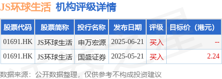 投行对该股的评级以买入为主,近90天内共有2家投行给出买入评级,近90天的目标均价为2.24港元。申万宏源最新一份研报给予JS环球生活买入评级。