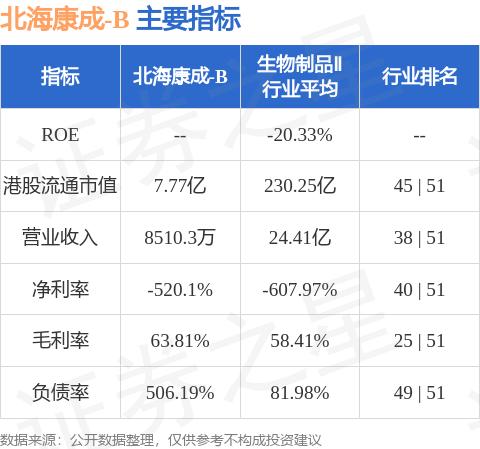 北海康成-B港股市值7.77亿港元,在生物制品Ⅱ行业中排名第45。主要指标见下表: