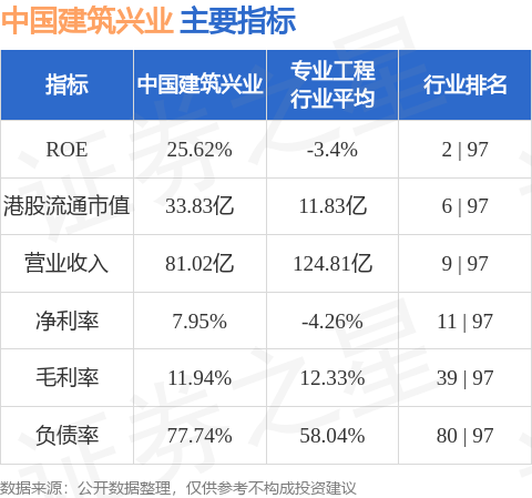 中国建筑兴业港股市值33.83亿港元,在专业工程行业中排名第6。主要指标见下表: