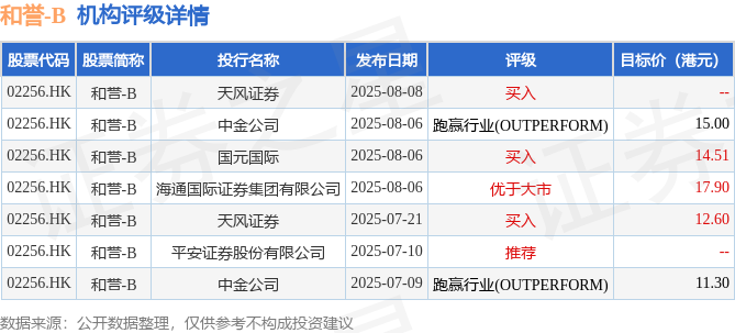 投行对该股的评级以买入为主,近90天内共有3家投行给出买入评级,近90天的目标均价为14.26港元。天风证券最新一份研报给予和誉-B买入评级。