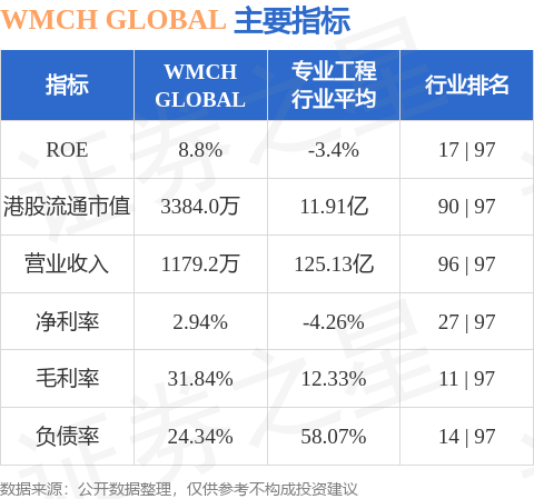 WMCH GLOBAL港股市值3384万港元,在专业工程行业中排名第90。主要指标见下表: