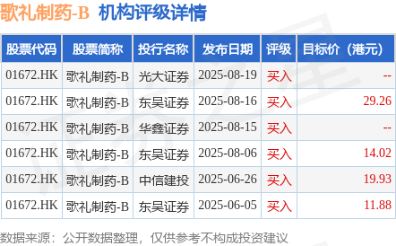 投行对该股的评级以买入为主,近90天内共有6家投行给出买入评级,近90天的目标均价为18.77港元。光大证券最新一份研报给予歌礼制药-B买入评级。