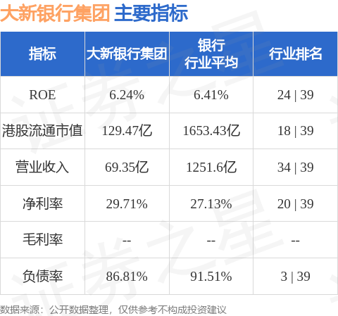 大新银行集团港股市值129.47亿港元,在银行行业中排名第18。主要指标见下表: