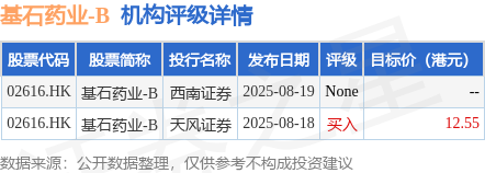 投行对该股的评级以买入为主,近90天内共有1家投行给出买入评级,近90天的目标均价为12.55港元。西南证券最新一份研报给予基石药业-BNone评级。