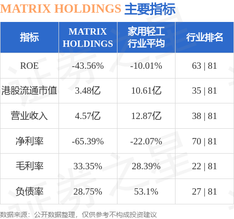 MATRIX HOLDINGS港股市值3.48亿港元,在家用轻工行业中排名第35。主要指标见下表: