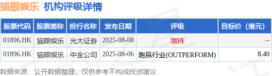 截至2025年8月25日收盘,猫眼娱乐(01896.HK)报收于8.07港元,上涨1.0%,成交量715.23万股,成交额5729.37万港元。投行对该股的评级以跑赢行业(OUTPERFORM)为主,近90天内共有1家投行给出跑赢行业(OUTPERFORM)评级,近90天的目标均价为8.4港元。光大证券最新一份研报给予猫眼娱乐增持评级。