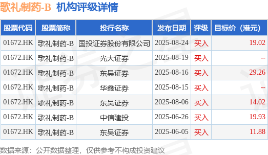 投行对该股的评级以买入为主,近90天内共有7家投行给出买入评级,近90天的目标均价为18.82港元。国投证券股份有限公司最新一份研报给予歌礼制药-B买入评级,目标价19.02港元。