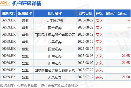 投行对该股的评级以买入为主,近90天内共有9家投行给出买入评级,近90天的目标均价为21.43港元。太平洋证券最新一份研报给予盛业买入评级。
