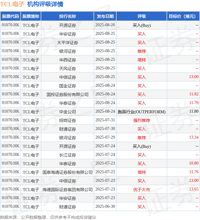 投行对该股的评级以买入为主,近90天内共有13家投行给出买入评级,近90天的目标均价为12.32港元。开源证券最新一份研报给予TCL电子买入(Buy)评级。