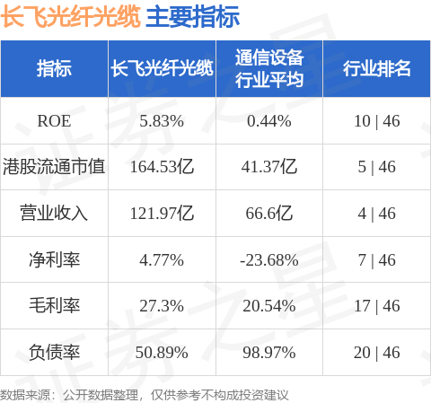长飞光纤光缆港股市值164.53亿港元,在通信设备行业中排名第5。主要指标见下表: