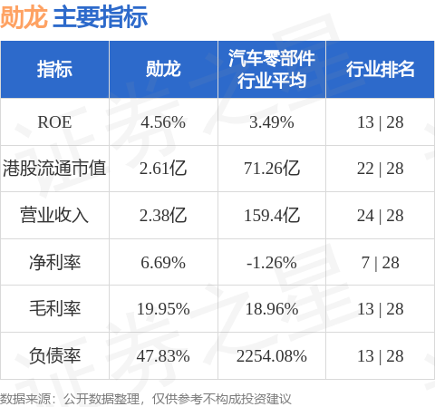 勋龙港股市值2.61亿港元,在汽车零部件行业中排名第22。主要指标见下表: